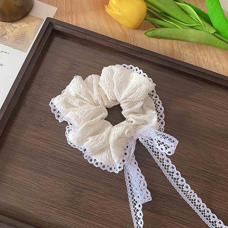 Andelaisi Boho Bow Hair Scrunchies Lace Elastic Scrunchies Vintage Lace Elastic Hair Rope Big Scrunchy Lace Bands Rope Ponytail Holder Hair Accessories for Women(White)