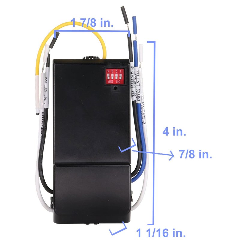 - Features: - Fan speeds: Off, low, med, high - Power - Fan Time delay - Light on/off/dimming - Works lights with Incandescent, LED, CFL and E-Ballast bulbs - Requires two (2) AAA batteries (not included)