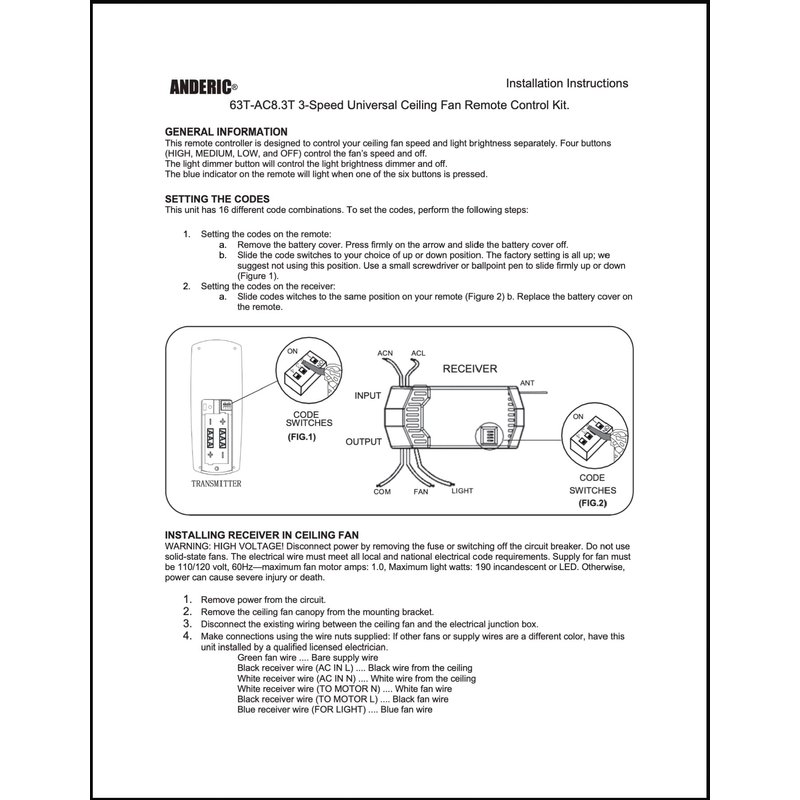 - The Anderic Universal Ceiling kit is designed to work with all 3-speed fans. If you want to add remote control functionality to your fan, this kit is for you. Anderic is a proud NC, USA company. 🇺🇸