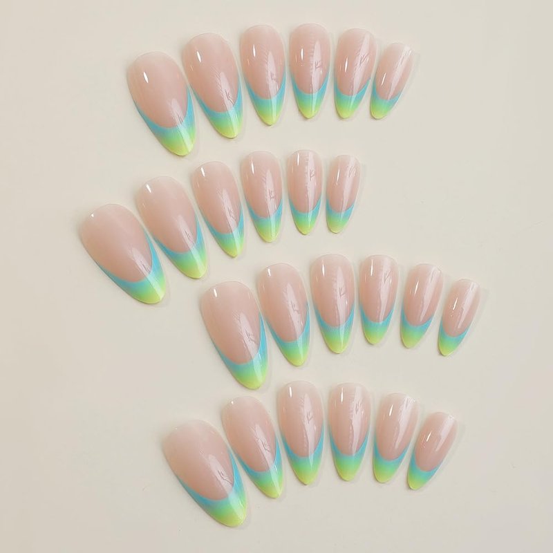 ANDGING Almond French Tip Press on Nails Neon Medium Length Fake Nails with Glue Acrylic Short Glue on Nails with Designs Aesthetic Gel Manicure False Nail for Women Stick ons Nails for Girls Wedding