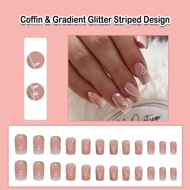 - ANDGING Coffin Press on Nails Short Medium Ombre White Glue on Nails with Gradient Glitter Gold Line Striped Design Acrylic Fake Nails for Wedding False Nails Women Manicure Stick on Nail with Glue