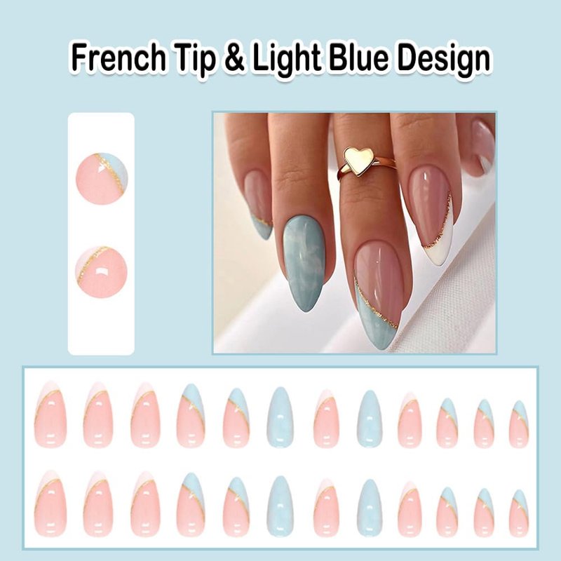 - ANDGING French Tip Press on Nails Almond Short Medium White Fake Nails with Light Blue Marble Design Glue on Nails for Women Acrylic Gel Stick on Nails with Glue False Nails for Wedding Birthday 24Pcs