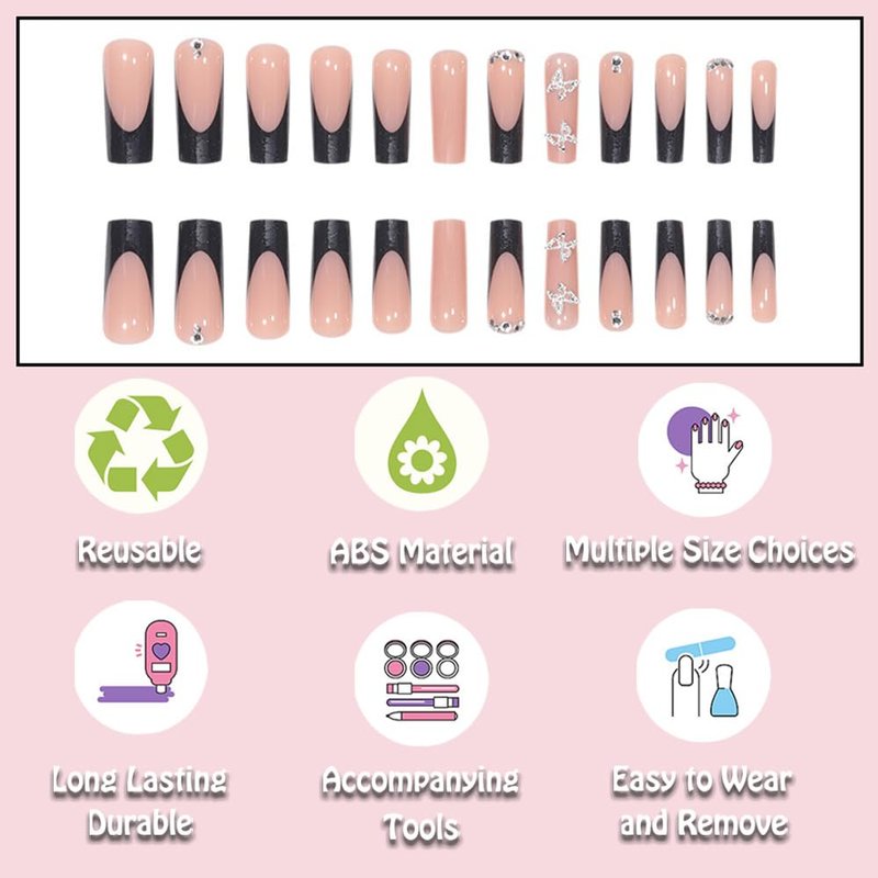 - ANDGING French Tip Press on Nails Black Ballet Square Medium Long Fake Nails Glue on Nails with Butterfly Rhinestone Design Acrylic Women False Nails with Glue Gel Stick on Nail for Wedding AL588T
