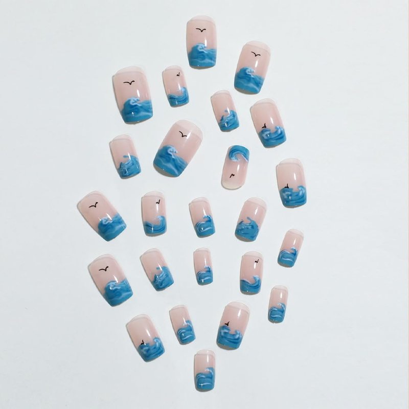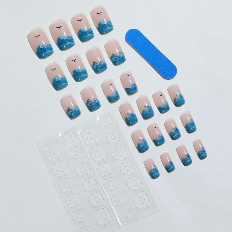 - ANDGING French Tip Press on Nails Short Square Blue Fake Nails Glue on Nails with Sea Wave Cartoon Design Manicure Acrylic False Nails with Glue Full Cover Gel Stick on Nail for Wedding Birthday CDL5