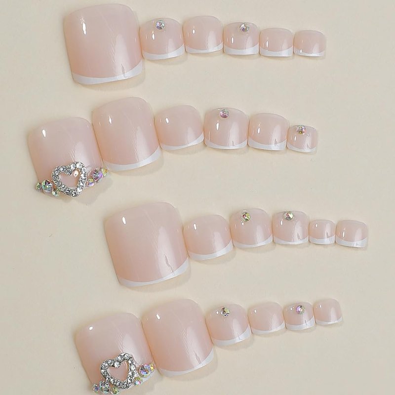ANDGING French Tip Press on Toenails for Women White Square Toe Nail Press ons Classy Heart Rhinestone Acrylic Toe Press on Nails Natural Toenail Fake Toe Nails Designs Glue on Toe Nails for Wedding