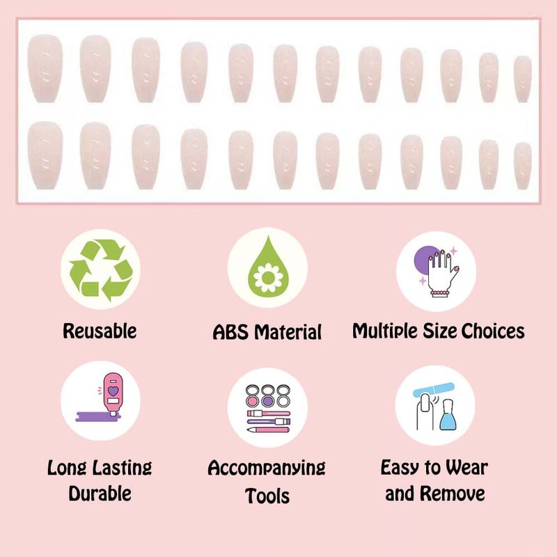 - [Package Include] You will get 24 pieces short press on nails in 12 sizes, 1 piece mini nail file, 1 pc of glue. Suggest: strong enough to last for 7-15 days if using glue. the durability of jelly gum is limited, I suggest you use your own glue. Nail adhesive tabs are better for temporary task, easy to remove and more friendly to natural nails.