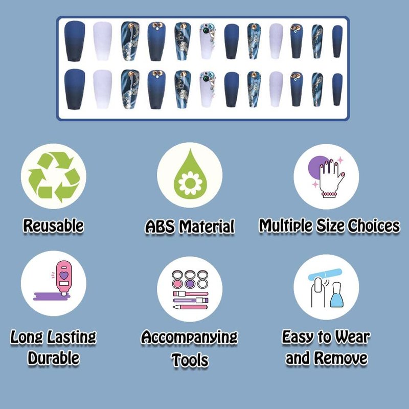 - Color: Blue White Glitter Press on Nails Long Coffin
