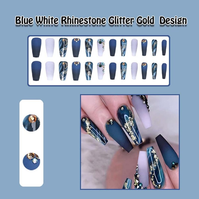 ANDGING Press on Nails Long Coffin Fake Nails for Women with Blue White Rhinestone Glitter Gold Design Glue on Nails Acrylic False Nails Cute Full Cover Stick on Nails for Wedding Birthday 24Pcs