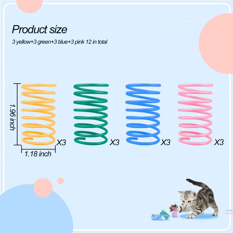 - 12pcs Cat Toys &4 Bright Colors: Cats like bright colors, there are 4 bright colors: pink,yellow, blue and green. Width is about 1.1inches, 2022 New design for colorful cat spiral springs. Our cat plastic springs can roll fast to attract your cat's attention