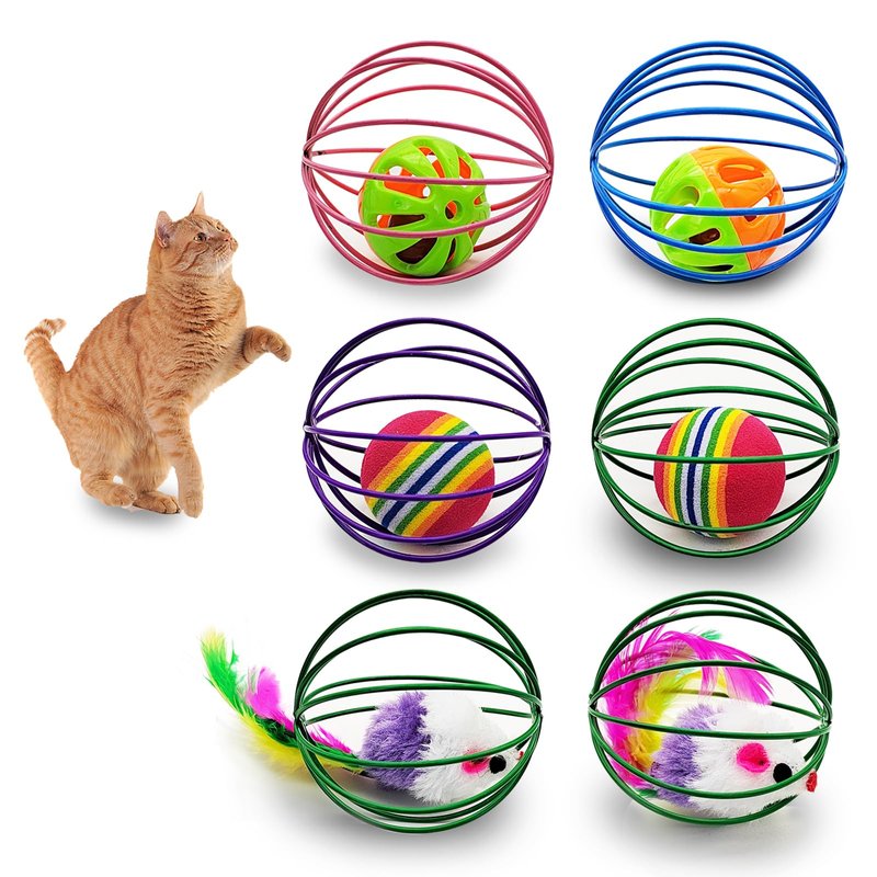 - Cat Spring Toy with Mice & Balls: Each ball cage is built with a feather mouse a bell ball or a rainbow ball. These mouse bells are trapped in round wire cages that cats can't pull out, which will stimulate the cat's hunting instincts, making them excited and chase toys, burn energy during exercise, and stay healthy