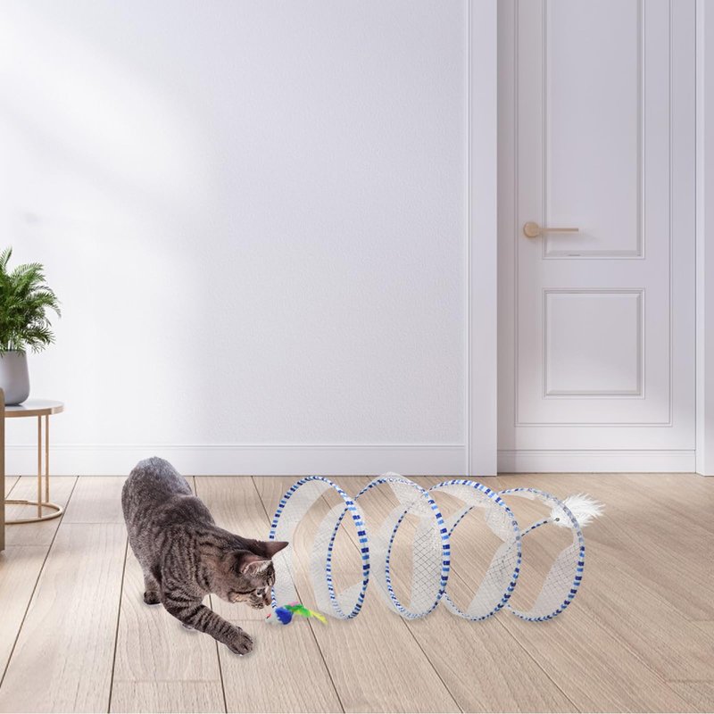 Product Description: Long periods of home life easily make cats feel bored, so preparing enough cat toys is very important to encourage them to exercise more, alleviate boredom, and reduce depression. Specifications: Color: Blue White, Orange Green White Yellow; Material : Mental, Fabric, Nylon Mesh, Feather, Small Bell; Package: 1* Cat Tunnel with feather and small fake mouse; Size : Normally unfolded and laid flat, approximately 0.5 meters long, diameter is 25 cm; The total length of the metal wire is about 3.5 meters; Weight : About 133 gram. Tips: Manual measurement, please allow for some slight errors. If your cat is not so interested in toys, you can try sprinkling a little catnip