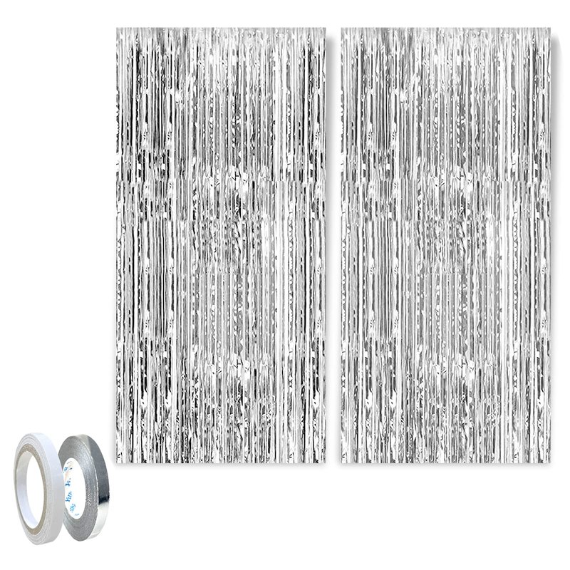 Andiker Foil Curtains Sets, 2 Thickened 1*2m Metallic Tinsel Foil Fringe Curtains and 1 Double Side Adhesive Tape and 1 Ribbon, Shimmer Curtains for Birthday Party Background Wall Decoration (Silver)