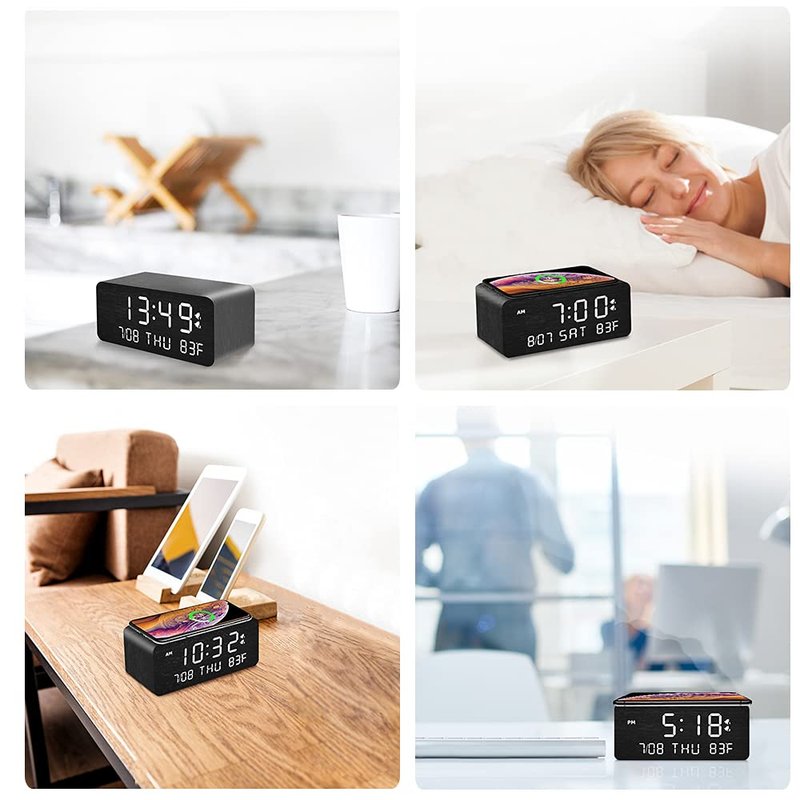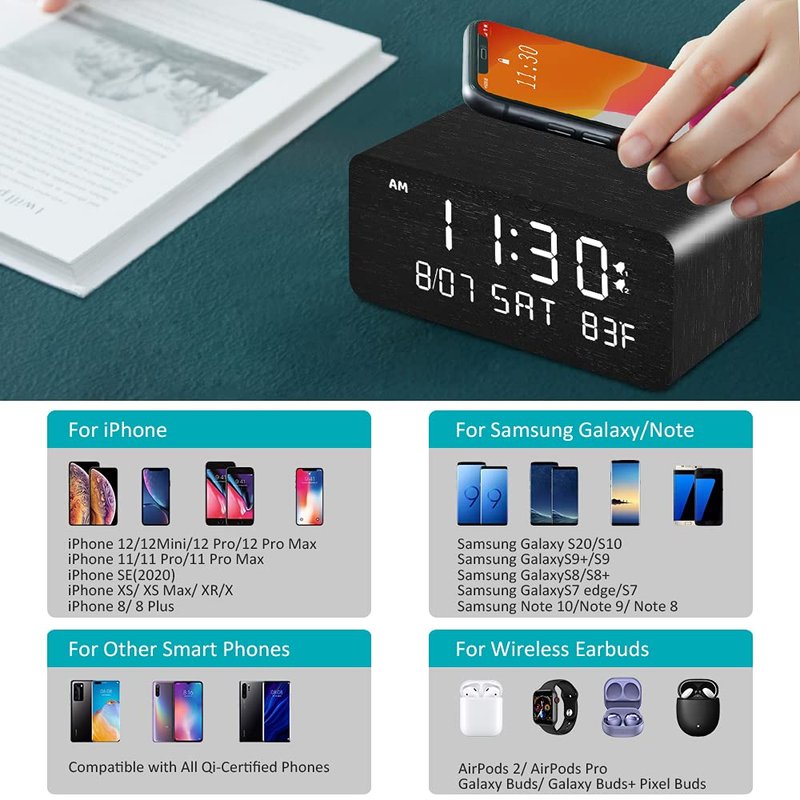 - 【Wireless Charging Alarm Clock】Wooden Alarm Clock with Wireless Charging support to charge your smart devices, convenient for you to place and charge your phone at the same time. The built-in Wireless Charging pad is compatible with all phones supports wireless charging so you can rest your device on top for easy charging with no wires.