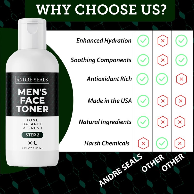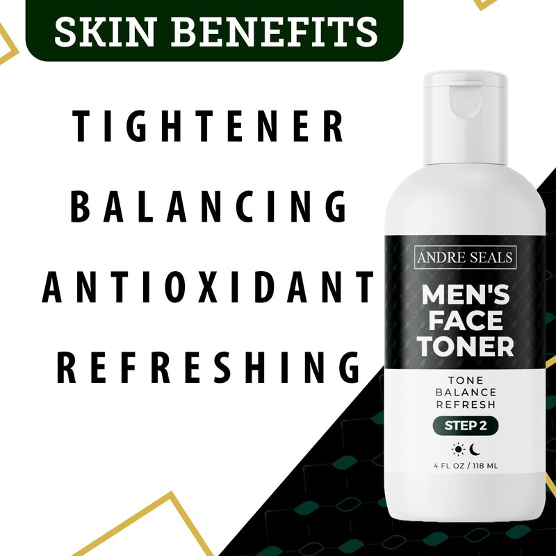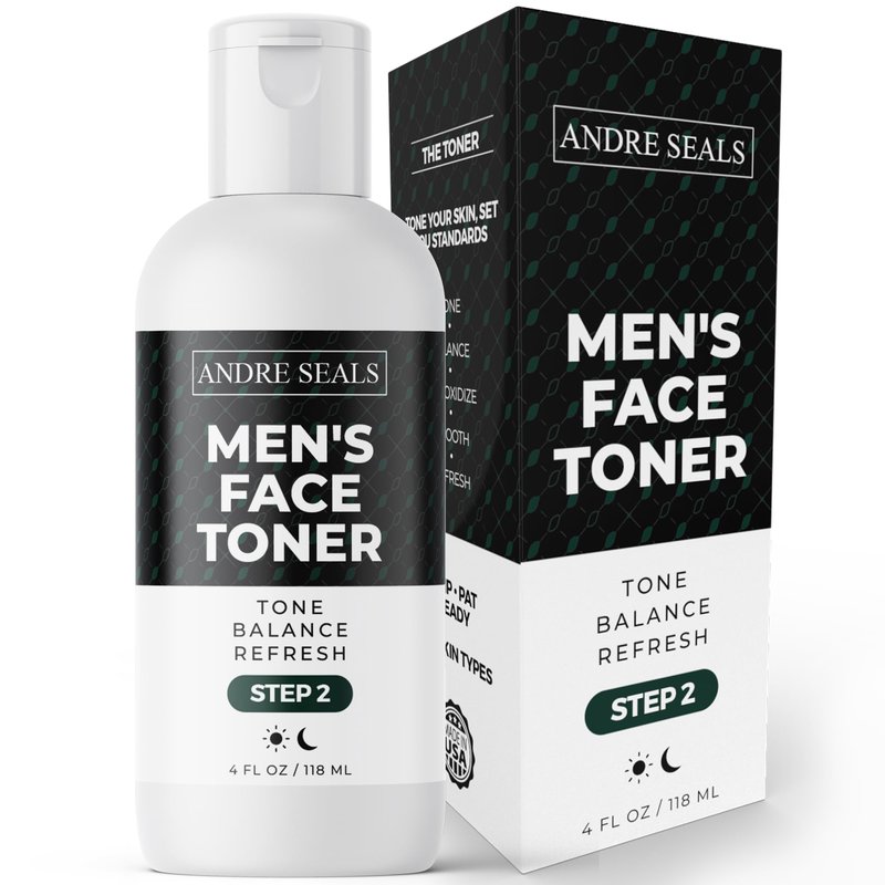 Elevate your skincare routine with ANDRE SEALS Face Toner for Men, designed specifically for the unique needs of male skin. This premium toner combines organic Witch Hazel, Green Tea extract, and potent Hyaluronic Acid to tighten, hydrate, and refresh your complexion. It effectively reduces the appearance of large pores and soothes razor burn, making it an essential part of your daily self-care. Experience the natural astringent benefits of Witch Hazel as it targets impurities and minimizes pores, while Green Tea extract offers a rich source of antioxidants for a healthier, more youthful look. Hyaluronic Acid provides deep hydration, enhancing the skin's texture and reducing signs of aging. This alcohol-free formula also serves as an excellent aftershave, soothing your skin without causing dryness or irritation. Ideal for addressing various skin concerns, ANDRE SEALS Face Toner is a versatile addition to any grooming routine, promoting a refined and vibrant complexion. Embrace the sophisticated simplicity of effective skincare with ANDRE SEALS.