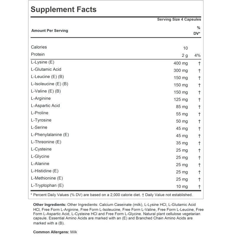 - PROVIDES AN IDEAL BALANCE OF AMINO ACIDS. Supports the structure and function of our key organs and tissues, along with the enzymes we rely upon to perform all our body’s biochemical and metabolic activities. SMALL, EASY-TO-SWALLOW CAPSULES. Hormone-free, lactose-free and sodium-free.