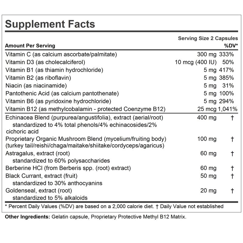- SUPERIOR Pure BIO-ACTIVE INGREDIENTS – Delivers standardized blend of Echinacea (Purpurea and Angustifolia), Goldenseal, Astragalus, Proprietary organic mushroom blend (Shiitake, Maitake and Reishi), high levels of B-complex vitamins and non-acidic Vitamin C. Contains NO Milk / Dairy-Free, Gluten Free; NO soy, yeast, wheat, sodium, salt, sugar, fat, cholesterol, color, preservative, common allergens or manufacturing additives.