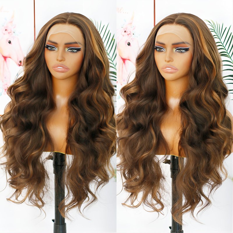 ANDRIA Highlight Brown Lace Front Wigs Long Body Wave Glueless Natural Wave Transparent lace Wig Synthetic Heat Resistant Fiber Hair Wig Pre Plucked With Baby Hair For Women 24 Inch