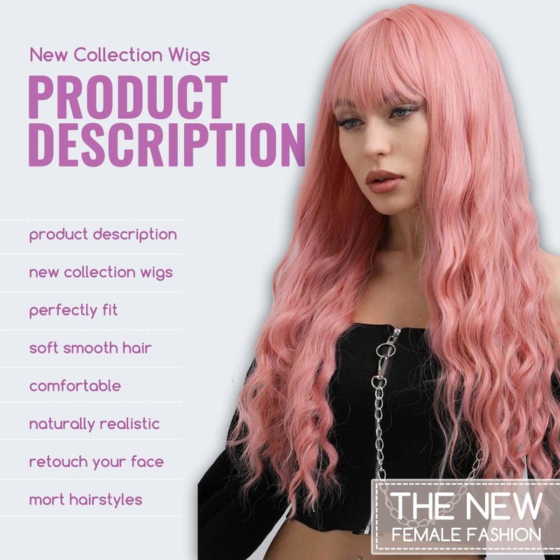 Wig style:Pink long wavy wig with bangs. Bangs can be trimmed to different lengths .