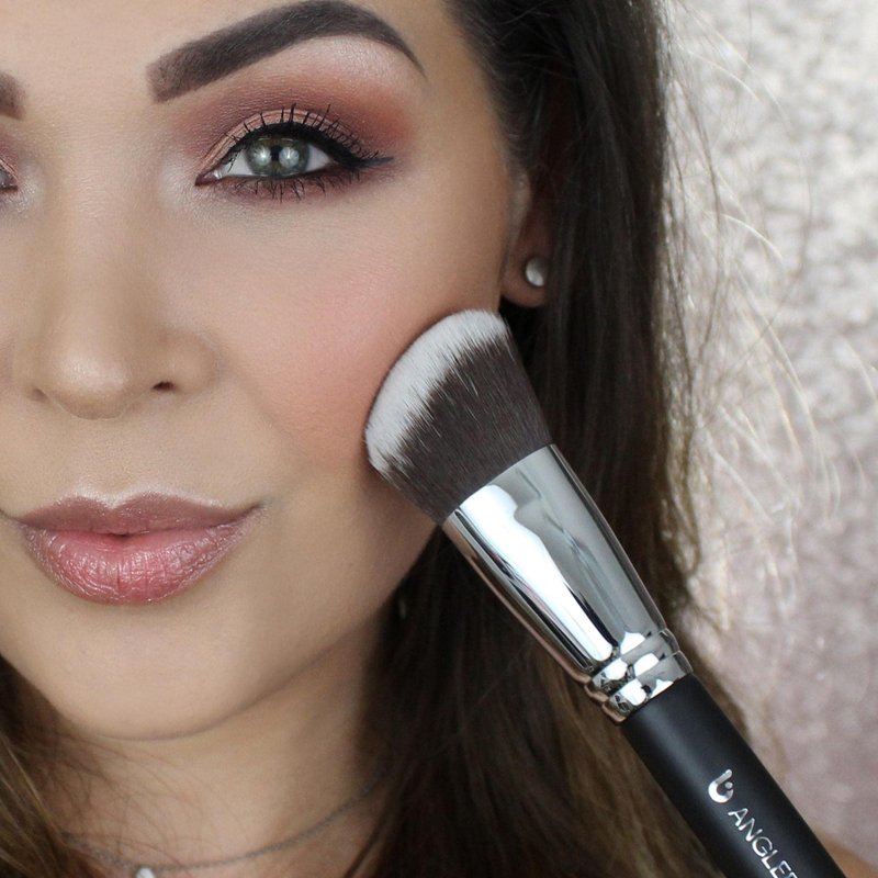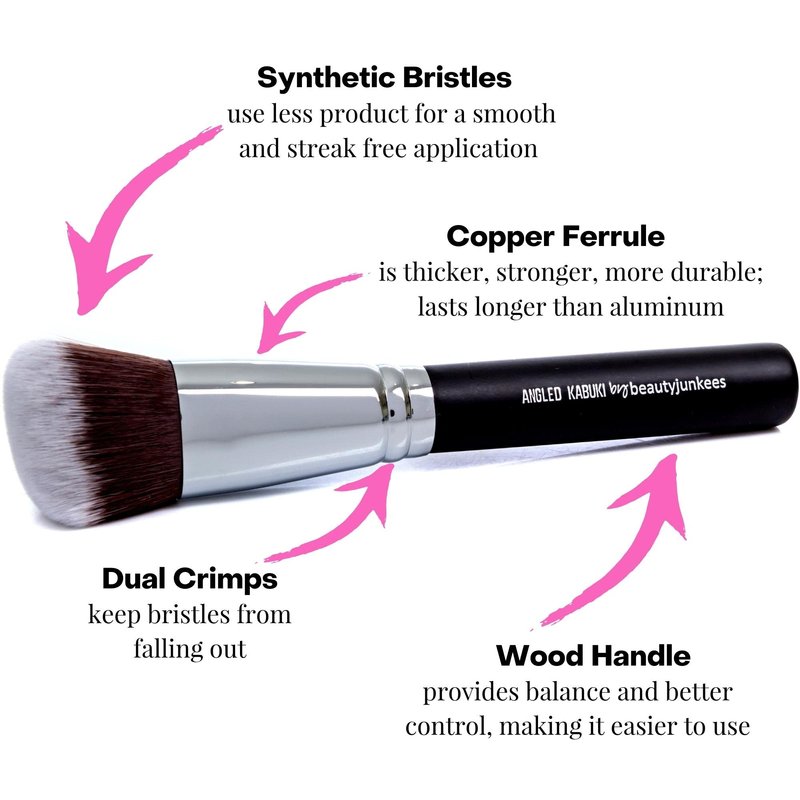 The key to a great blush brush is one that the bristles are as wide as the apples of your cheeks, and have a soft angle that fits the hollow of your cheeks. A soft, yet firm bristle head will allow you to place as much or as little blush as desired, while being able to evenly blend out for a flawless finish. Beauty Junkees Angled Kabuki Makeup Brush was designed with a soft angle that fits the natural contour of the cheek.