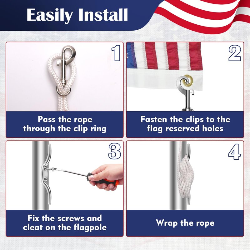 Anglekai 50FT/ 100FT Flag Pole Rope Line Kit, 5/16 in Flag Rope and Clips Kit Replacement with 4PCS Swivel Flag Pole Hook Clips/Cleat Hook (50FT)