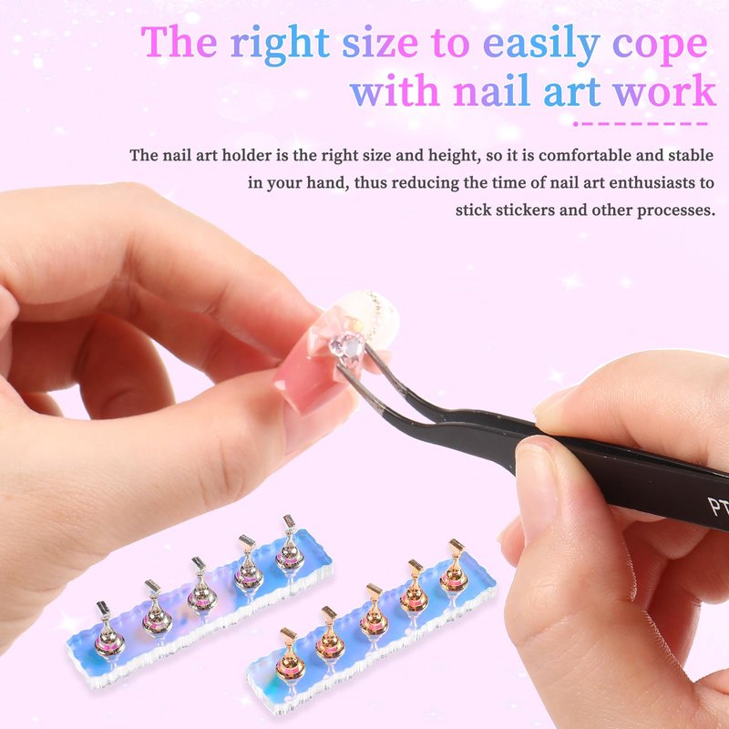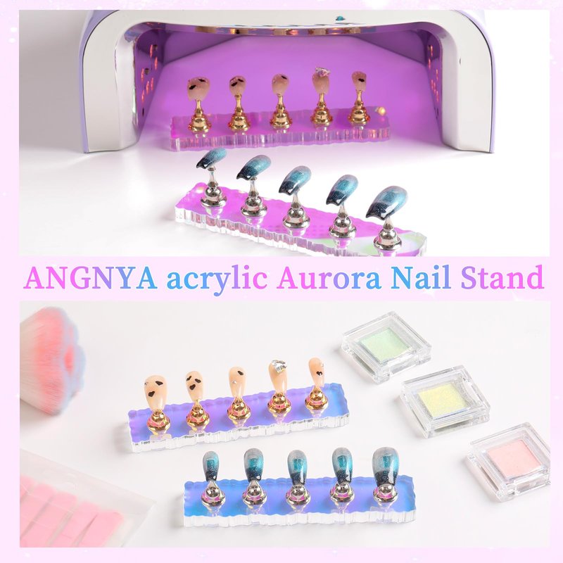 - 【ANGNYA Press on Nail Stand】You will get 2 acrylic aurora nail bases ,5 golden practice nail holders and 5 silvery practice nail holders and 96pcs pink reusable adhesive putty. nail holder for painting nails is great for display your nail art, practicing painting your nails, or holders for press on nails, Nail tech must haves, great add-ons for your press on nail kit.