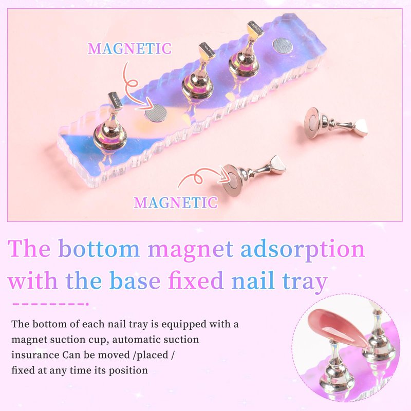 - 【Metal Nail Display Stand】Our magnetic nail art display holder are made of metal, sturdy enough for long time use, compact and lightweight, easy to carry, you can take it anywhere to design or display your nails.Our nail holder for painting nails has holographic rainbow and crystal clear looking. It will show the different aurora color on the different lights, and the aurora base can display a set of 10 nails.