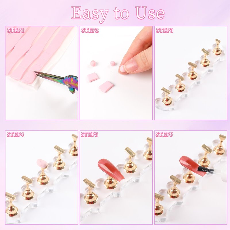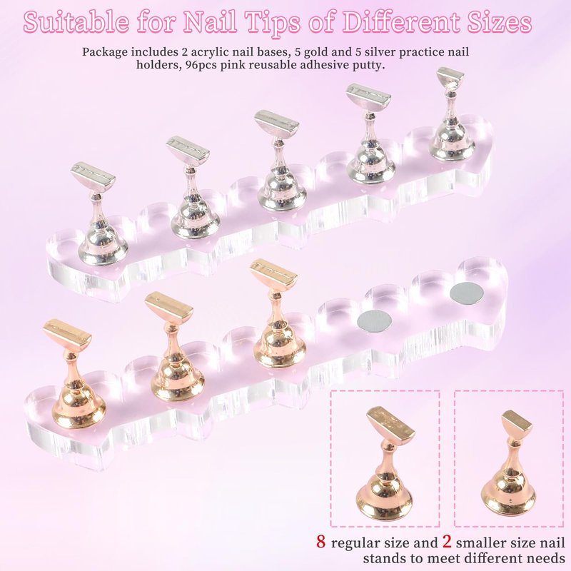 - 💚【ANGNYA Nail Stand Set】The set will come 2 acrylic nail stand bases, 5 gold and 5 silver practice nail holders, and pink reusable adhesive putty clay. With the nail holders, you can design your press ons to create artificial nail sets. These nail stands for painting nails are sturdy and durable enough for your daily use.