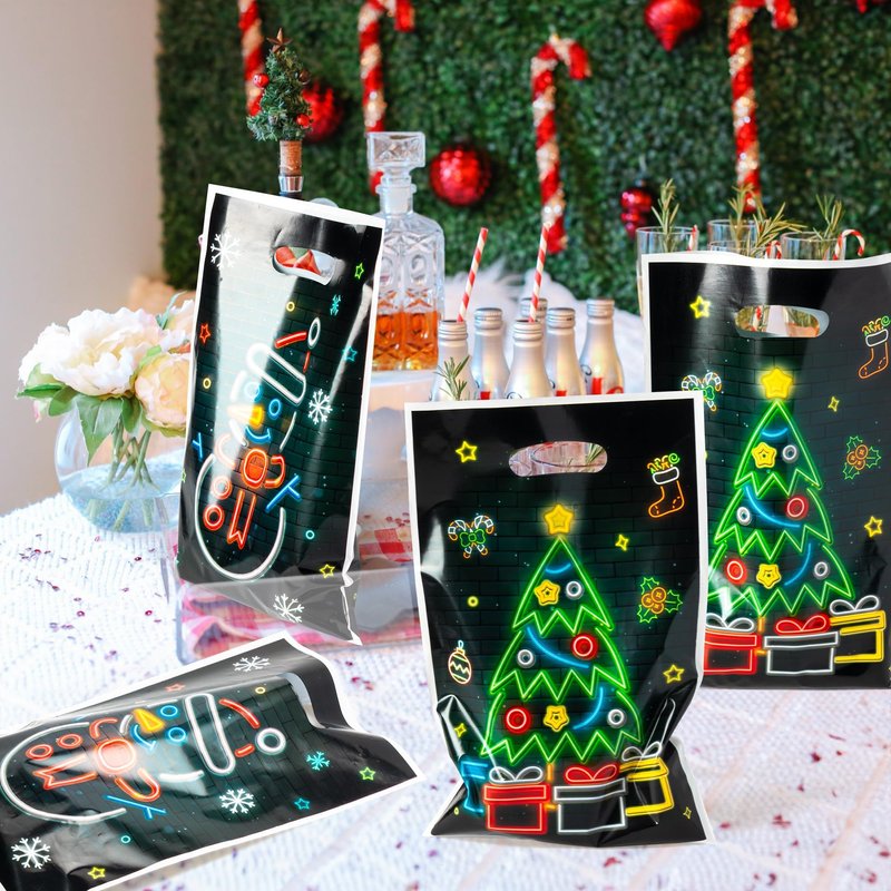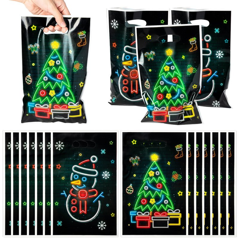 - Christmas Theme Party Decorations: Our Christmas Tree and Snowman party favor plastic bag print Christmas Tree and Snowman and snowflakes, novel and chic. Also, all the bags have different patterns and colors printed on both sides, so whether the bag is the front or the back, the Glow In The Dark plastic bag is the most attractive.