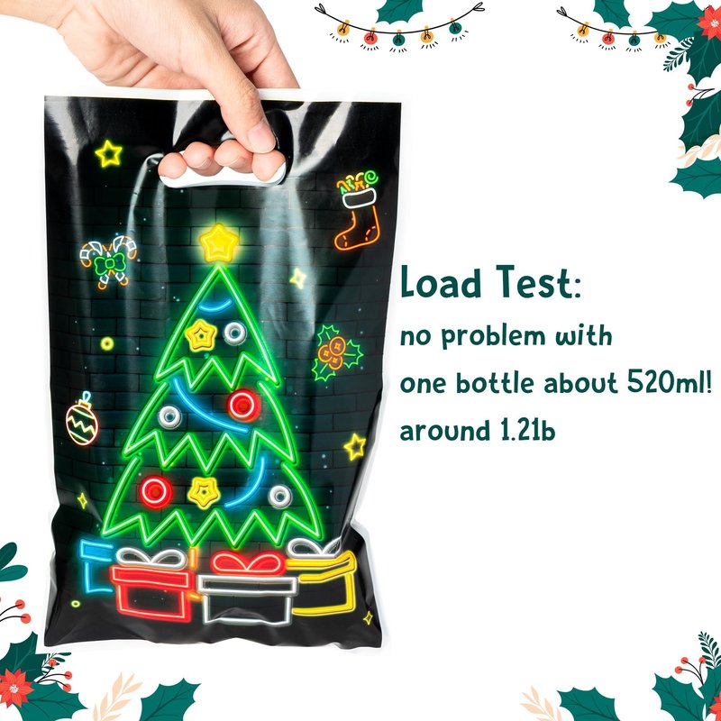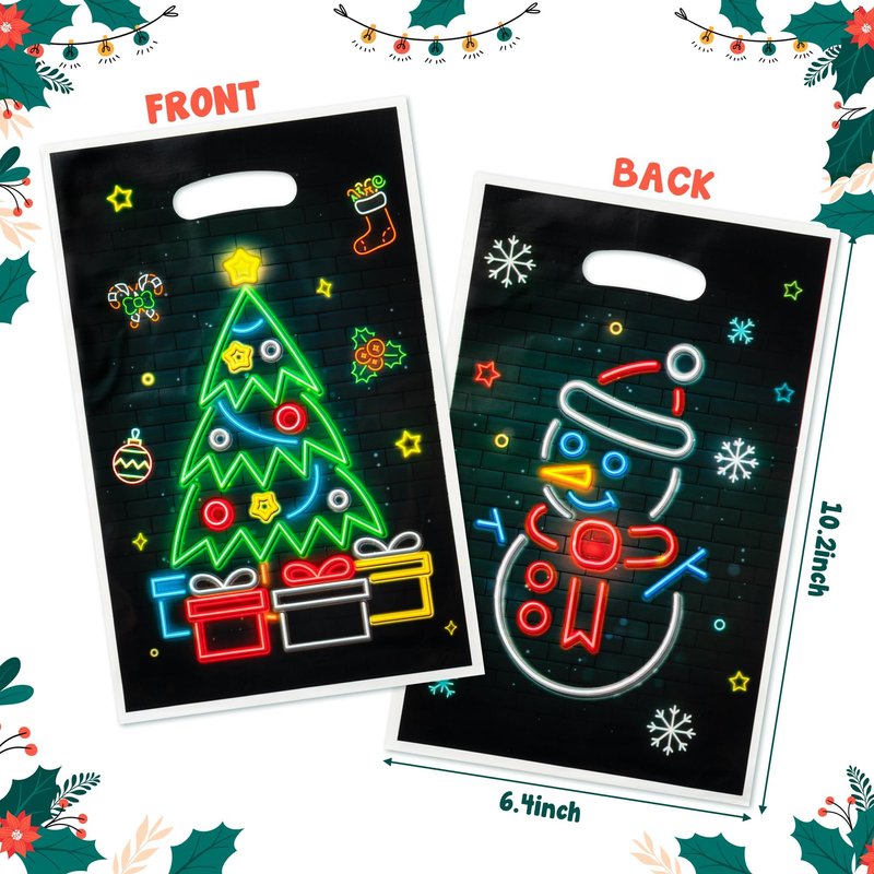 - Enough Quantity: Package includes 50pcs Christmas Glow In The Dark plastic bag, which are printed with Christmas Tree and Snowman and perfect as a gift bag for child Christmas party, upcoming winter party. Offer enough quantity to meet your needs for party, events or daily use.