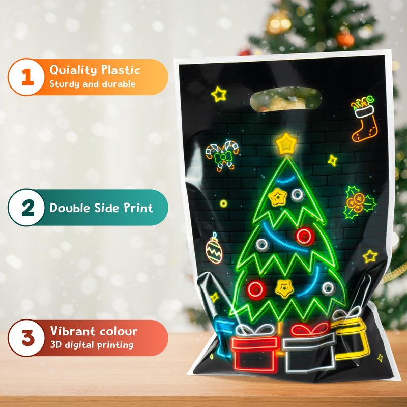 - Resuable and Strong: Christmas Glow In The Dark plastic favor bag are made of safe and no smell PE material, strong, reusable so that so you can fold and store them for the next parties. Smooth surface and won't cut kid's hands. Also, they are designed with cut-out handles that will be easy and convenient for your carrying.