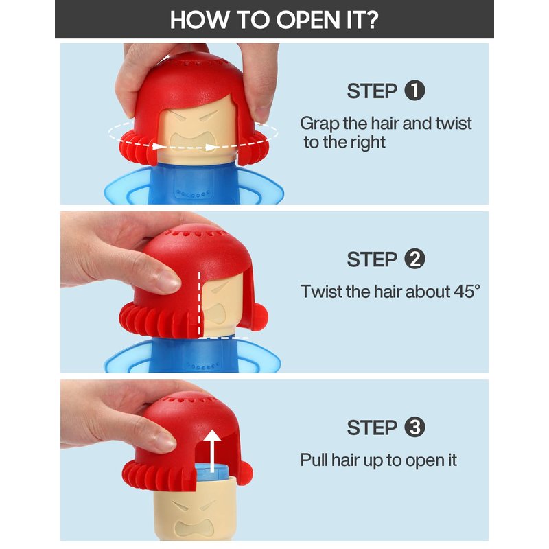 - CUT MICROWAVE CLEANING TIME IN LESS THAN HALF MAGICALLY WITH 3 SIMPLE STEPS - 1) Remove Angry Mama’s hair. 2) Add vinegar and water to the fill lines. 3) Attach Angry Mama’s hair back and place it into your microwave.