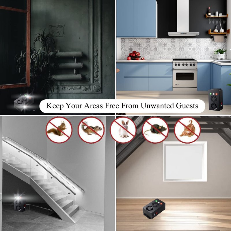 The humane animal deterrent device emits alternating continuous ultrasonic waves and flashlights to disrupt the darkness and quiet that rodents prefer. Keep rabbits,mice, rats, cats and other pesky rodents from making themselves at home at your attic, garage, kitchen, shed or basement and so on.