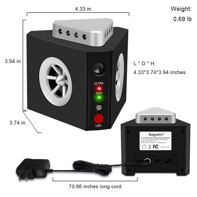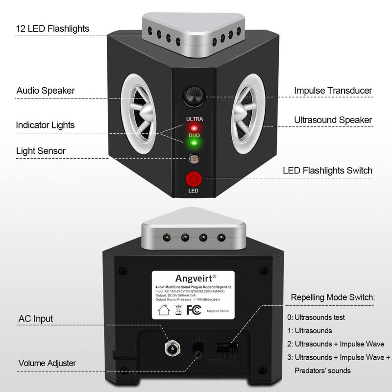- 4-In-1 Multifunctional Rodent Repellent | Invention Patent Pending - Not only emits fluctuating ultrasonic waves, powerful 12 strobe lights but also emits blasting impulse attack waves and mice predators' sounds