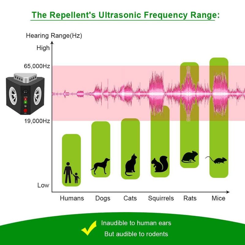 - Exclusive Mouse Predators' Sounds - The audio speaker will automatically play a loop of 10 kinds of audible sounds that rodents are most afraid of, turn down the volume if your pets are nearby