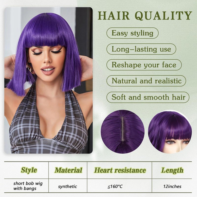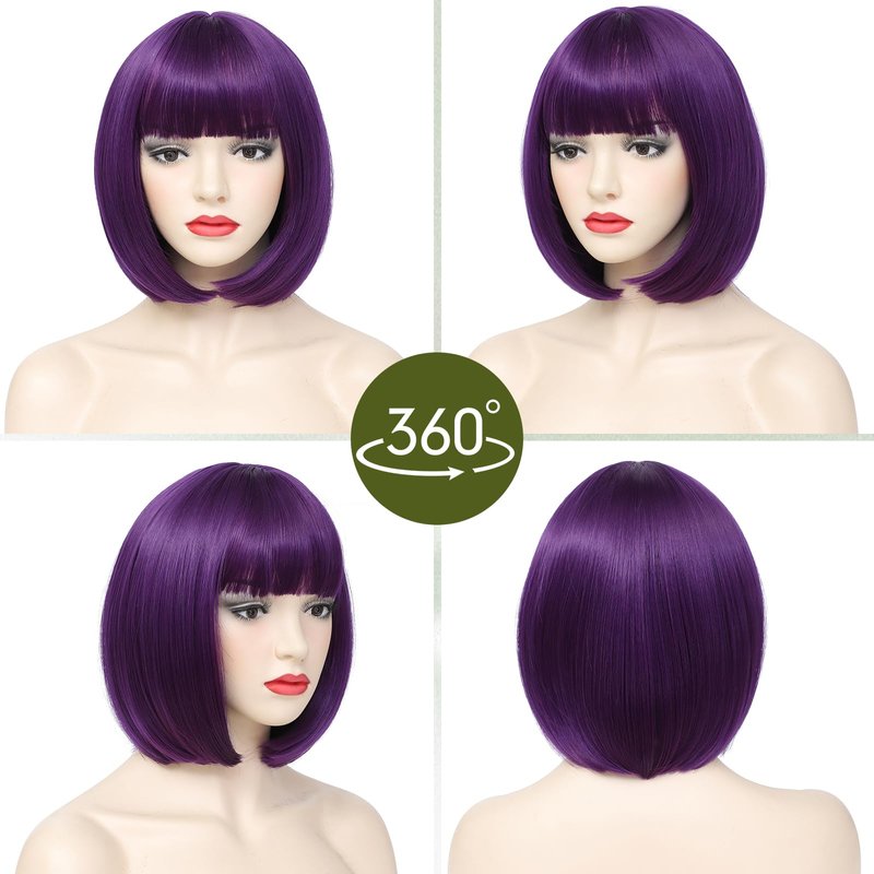 Angzon Purple Bob Wigs with Bangs Short Straight Bob Wigs For Women Shoulder Length Synthetic Bob Wigs For Halloween Daily Party Cosplay