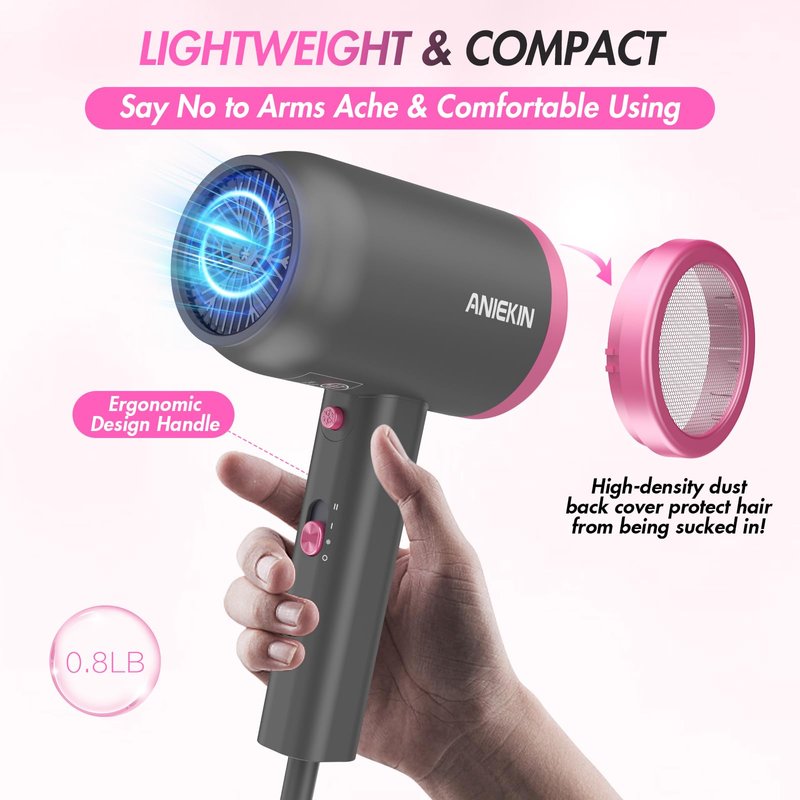 - 【Lightweight & Compact Design】The portable hair dryer boasts a small compact and a weight of 0.8lb that prevent from arm cramps and achieve effortless using. The unique handle of travel hair dryer ensure comfortable usage due to the ergonomic design. Furthermore, high-density dust back cover protect your hair from being pulled in.