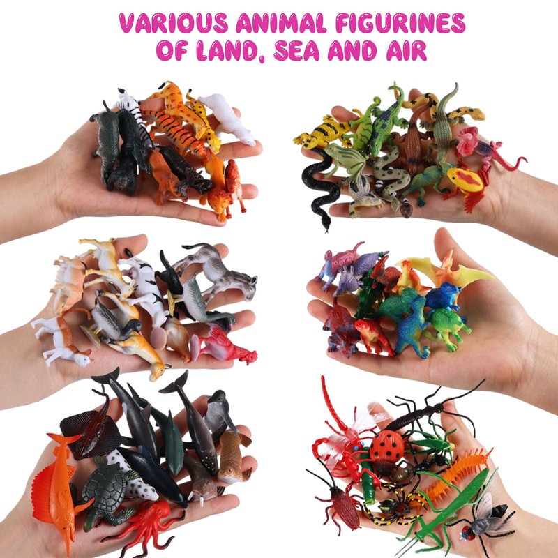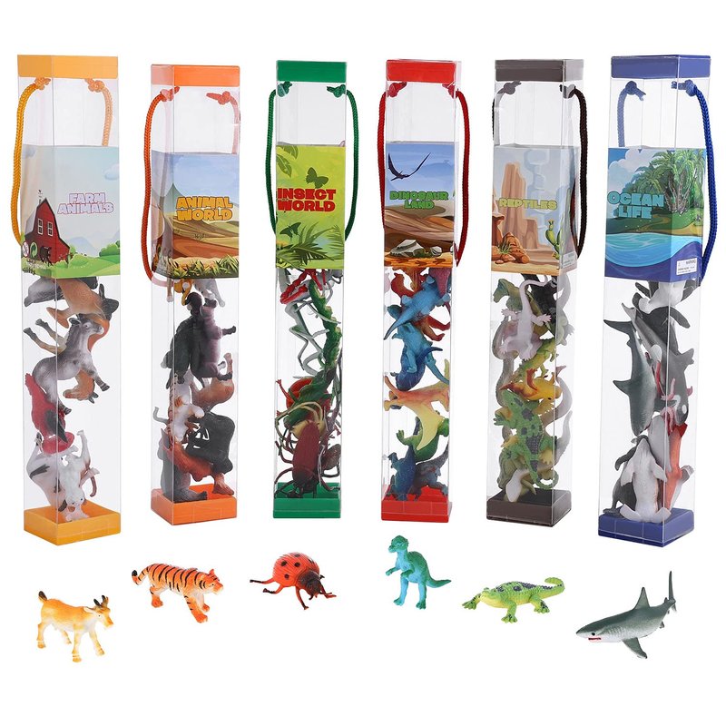 - Comprehensive Animal Playset: Includes 6 themed toobs with a total of 72 pieces - 12 Insect Animals, 12 Farm Animals, 12 Reptile Animals, 12 Wild Animals, 12 Sea Animals, and 12 Dinosaur Toys. Each set is stored in its own specific bucket for easy organization and storage.