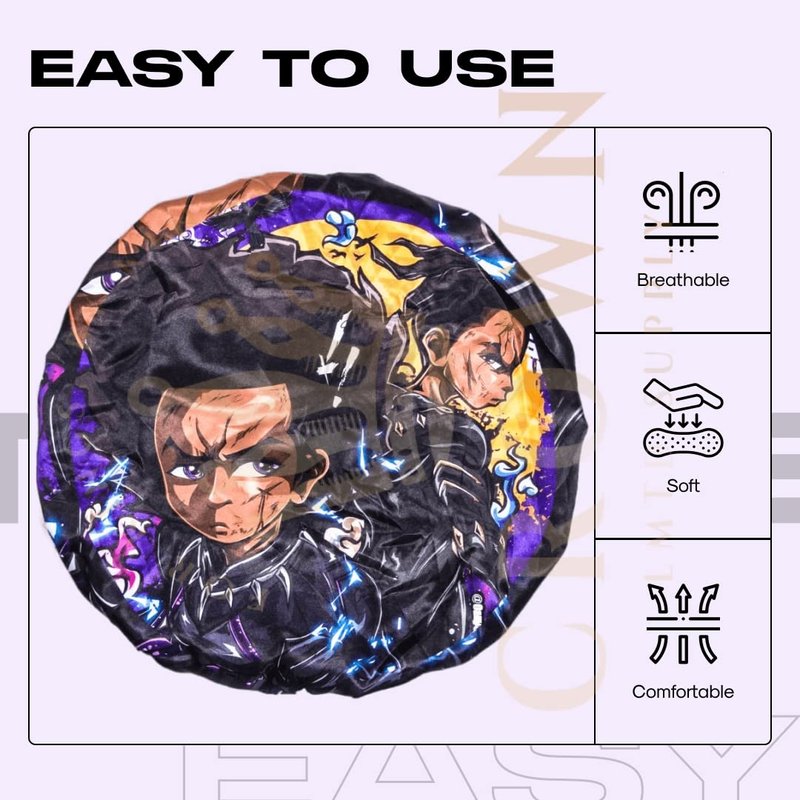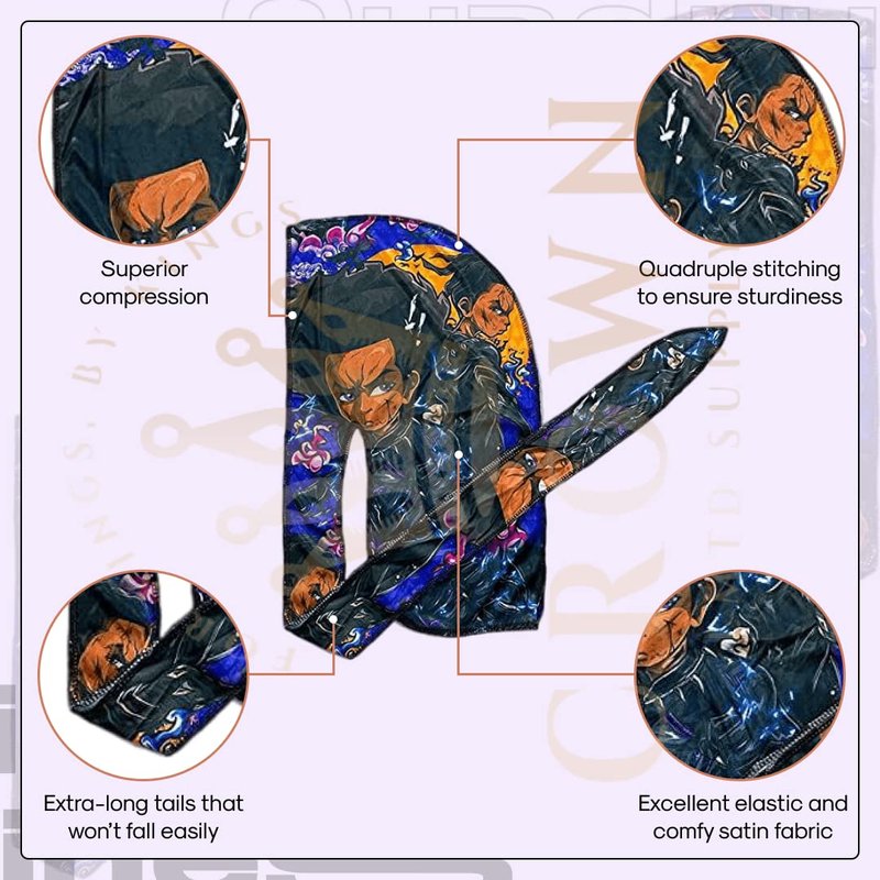Anime Durag and Silk Bonnet 2pcs Set for Men and Women, Silky Satin Bonnet Durag, Silk Fabric for Comfort and Compression (Dark Huey)
