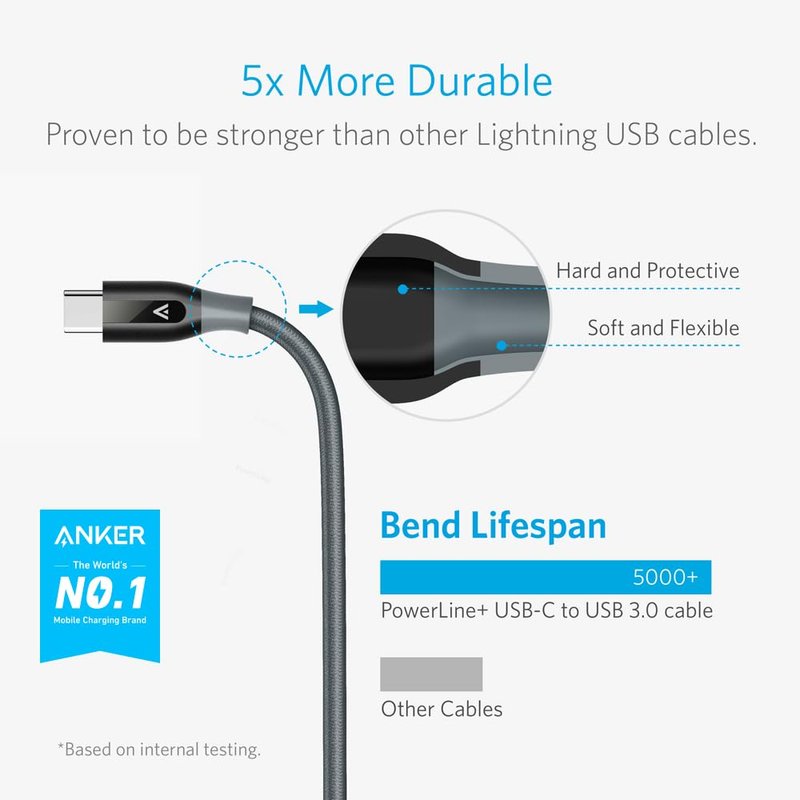 - Lasts 5X Longer: Double-braided nylon exterior, toughened aramid fiber core, and laser-welded connectors equip PowerLine+ with superior toughness from end-to-end.