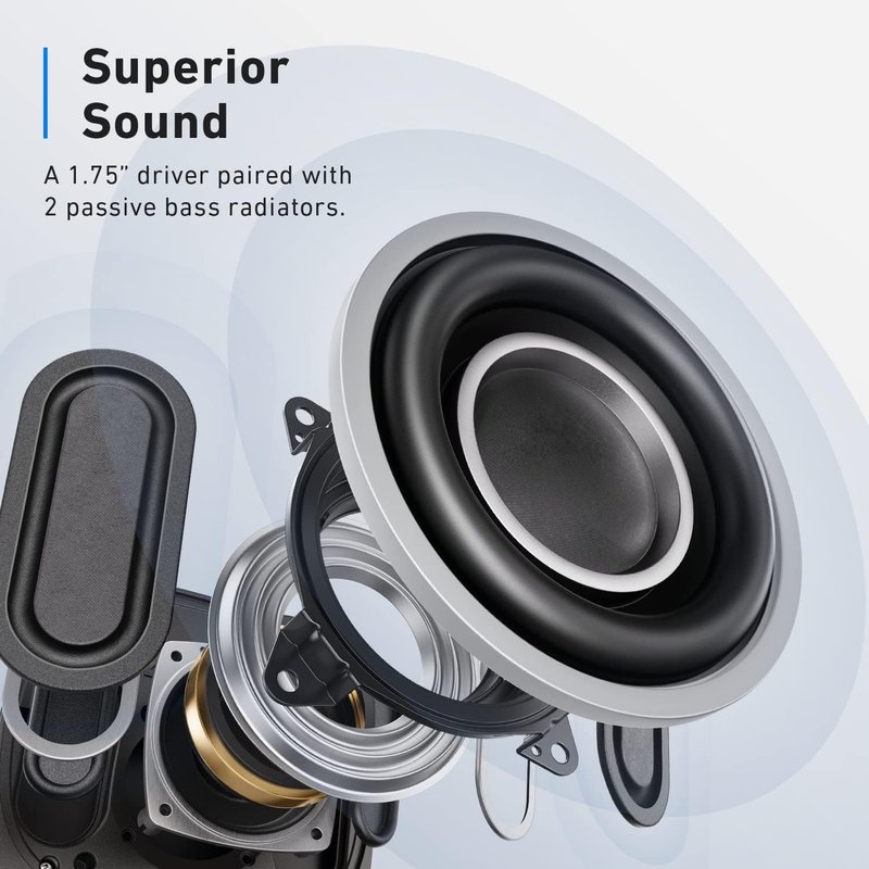 - Superior Sound: A 1.75” driver paired with 2 passive bass-radiators adds body and depth to both meeting audio and music.