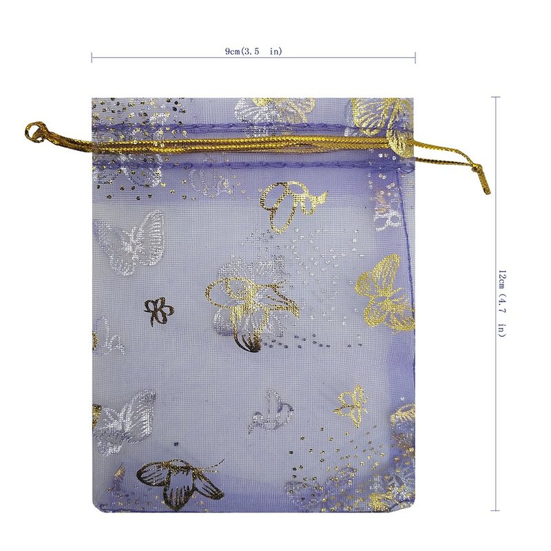 Ankirol 100pcs Mini Sheer Organza Wedding Favor Bags 3.5x4.5'' Luxury Jewelry Candy Gift Card Bags with Gold Line Drawstring Pouches Butterflies (Light Purple)