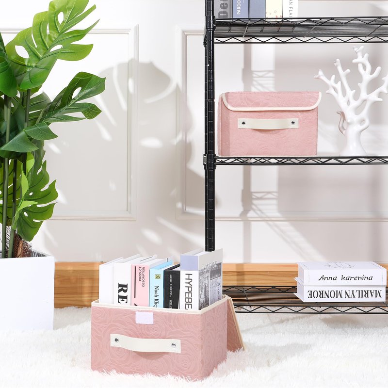 ANMINY Fabric Storage Bin with Lid Rose Print Storage Box Basket with PU Leather Handles Washable PP Plastic Board Decorative Foldable Lidded Shelf Cubes Closet Organizer Container - Pink, Small Size
