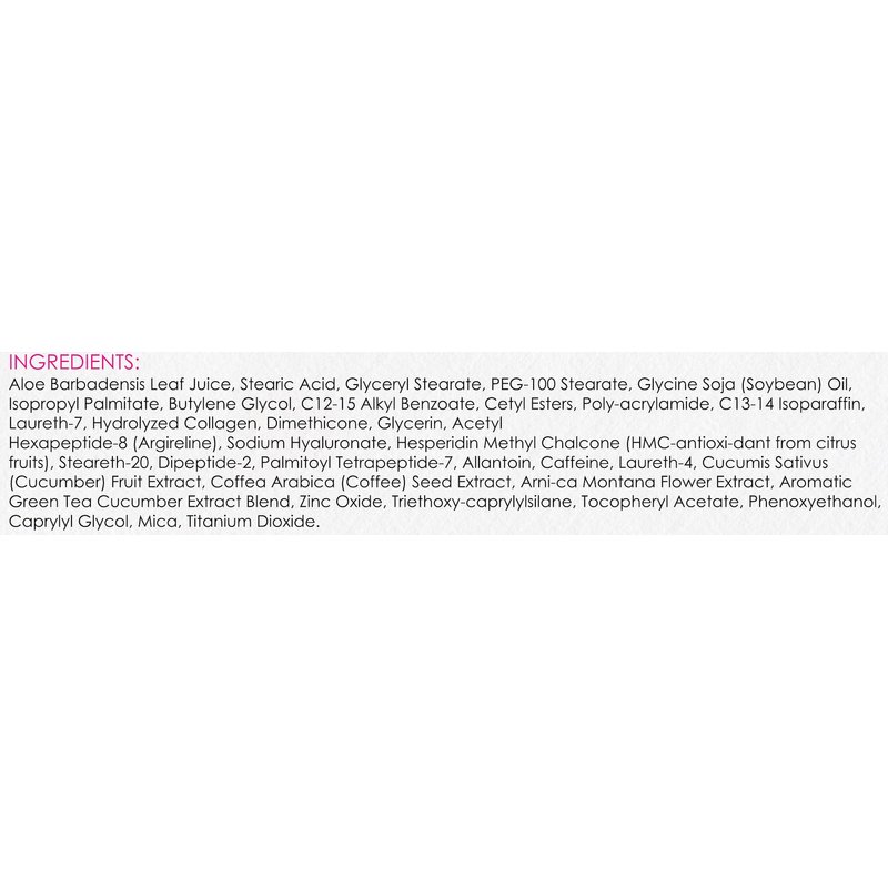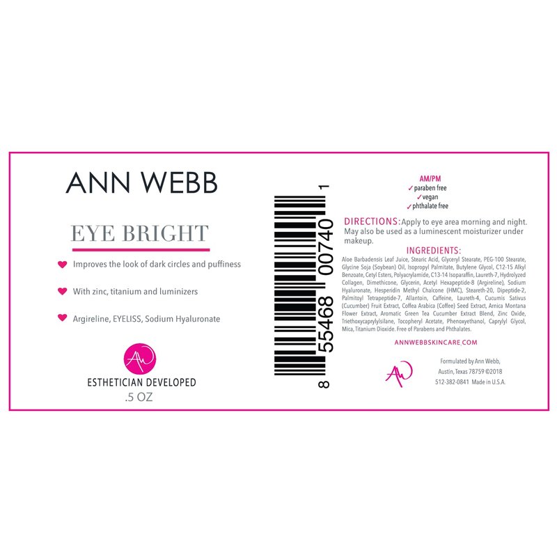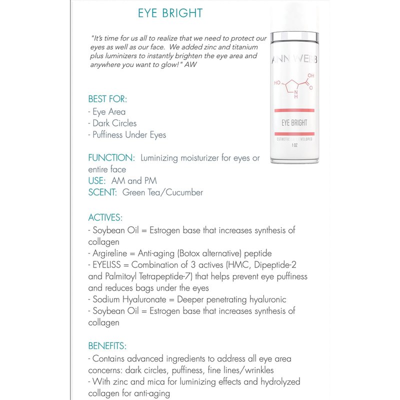ANN WEBB EYE BRIGHT: Non-greasy, anti-wrinkle cream w/ collagen peptides, hyaluronic acid to combat dark circles, puffiness, fine lines & wrinkles, while firming, hydrating, protecting & brightening eyes.Our ingredients: ALOE LEAF JUICE: Rich in enzymes & antioxidants which help fight free radicals. Contains vitamin A, B, C, E & folic acid. It can help soothe and soften the skin. It has been clinically proven to be effective for healing burns, wounds & scars. CUCUMBER: helps in reducing puffiness, hydrates skin. CAFFEINE: Wakes up your eyes. tightens & brightens dark circles & help reduce puffiness, boost circulation. SOYBEAN OIL: Soy proteins smooth the skin & keep it soft & supple. It also protects against hormonal skin aging. HYDROLYZED COLLAGEN: (collagen peptides) Reduces wrinkles & hydrates skin. SODIUM HYALURONATE: (Deeper penetrating hyaluronic) smoothes the appearance of wrinkles and improves the skin's texture. ARGIRELINE PEPTIDES: (known as the ‘natural botox’) Makes skin smoother and tighter, improves the appearance of fine lines and wrinkles. EYELISS FORMULA (3 active ingredients): - Hesperidin Methyl Chalcone: (flavonoid is present in lemons and oranges) Helps eliminate the formation of dark spots & uneven skin tone, helps reduces redness and irritation & fights free radicals. -Palmitoyl Tetrapeptide-7 & Dipeptide-2: Helps prevent eye puffiness & reduces bags under eyes and the skin damage. Believed to stimulate the regeneration of collagen in the dermis & improve the epidermal barrier. ALLANTOIN: Moisturizes & helps increase skin smoothness. COFFEA ARABICA SEED OIL: A potent antioxidant that can offer protection against skin damage.