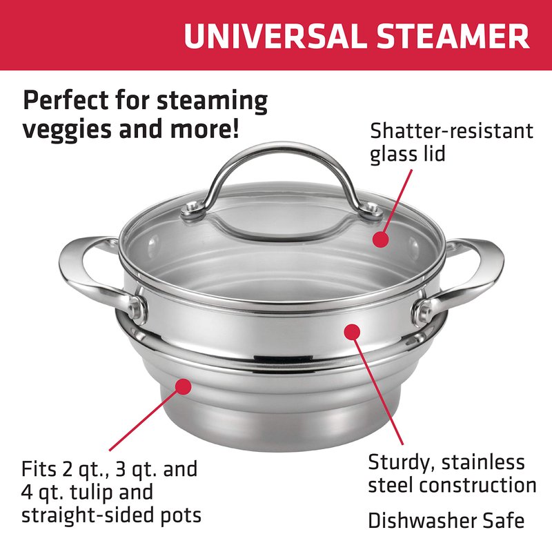 - UNIVERSAL STEAMER INSERT: Made of durable stainless steel, this steamer insert fits both tulip and straight-sided 2-quart, 3-quart and 4-quart sauce pots