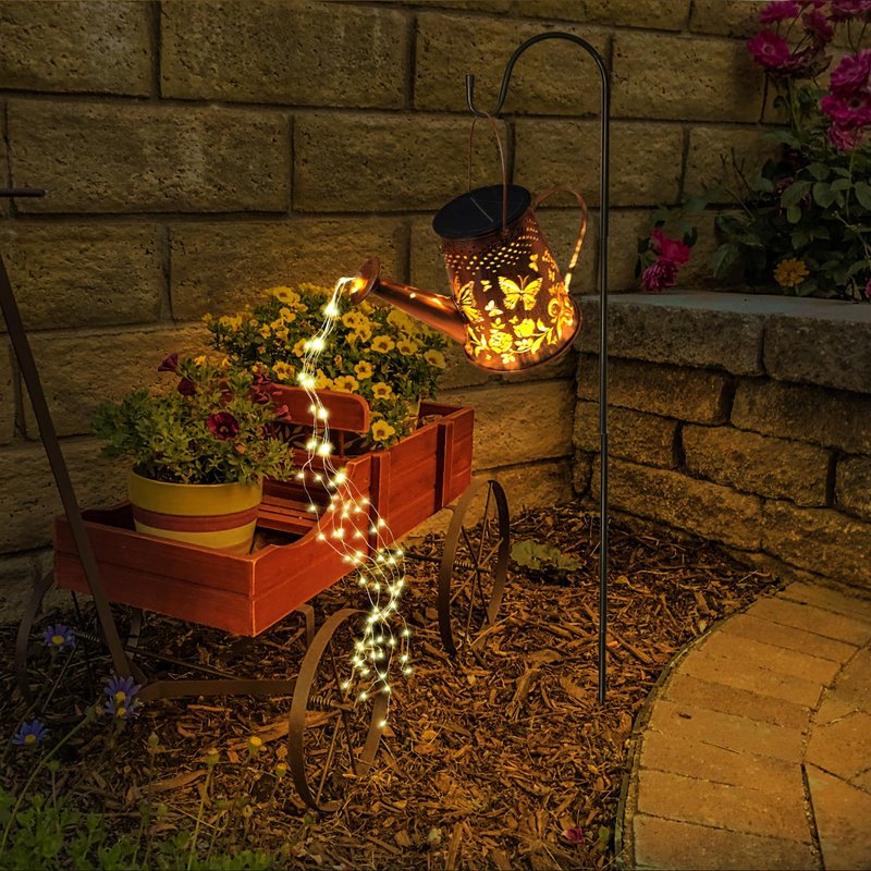 - 【EASY TO SET UP】-The light is with 39 inches shepherd hook, which makes it very convenient to hang it in your garden anywhere you like. And this watering can's body have beautiful hollow flower patterns, you can use it as outdoor table lanterns,when night falls,the watering can lit up and create beautiful unique flower light patterns on your tables.