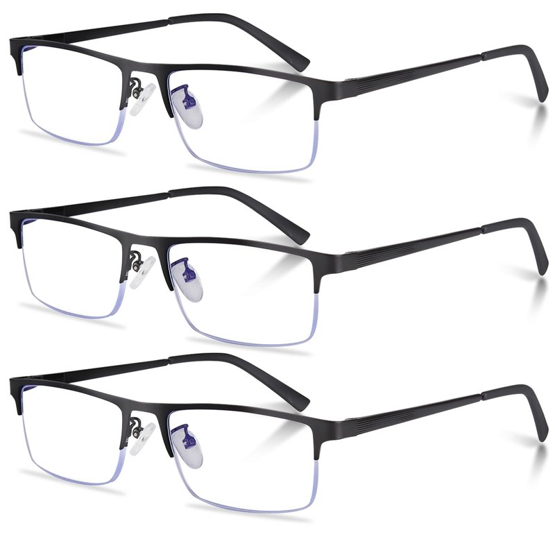 Anourney 3-Pack Reading Glasses for Men, Lightweight Metal Half Frame Blue Light Blocking Computer Readers,Filter UV Ray/Computer Glare with Spring Hinge Eyeglasses(3PCS Black,+2.0)