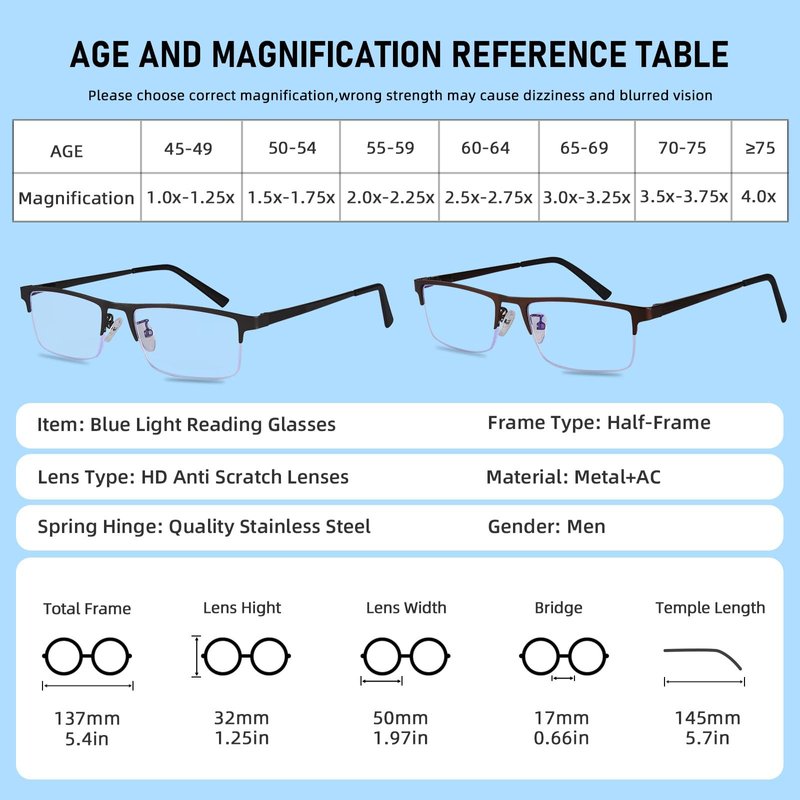 Lightweight Men Reading Glasses——Metal Half Frame Blue Light Reading Glasses, pressure-free on the nose and ears strengthen Reduce Eye Strain——Effectively block 100% of UVB and UVA rays, protecting eyes against long- term UV damage and keeping eyes healthy. Accurate Degrees——Magnification strength for you to chose: 1.00 1.25 1.50 1.75 2.00 2.50 Lens material: AC ( No glare & Clear vision ) Lens width: 50mm/ 2in Lens height: 30mm / 1.2in Frame material: metal Weight: 29g Package: Men’s blue light reading glasses*3, Microfiber glasses cleaning cloth*3 1-YEAR Money-Back warranty