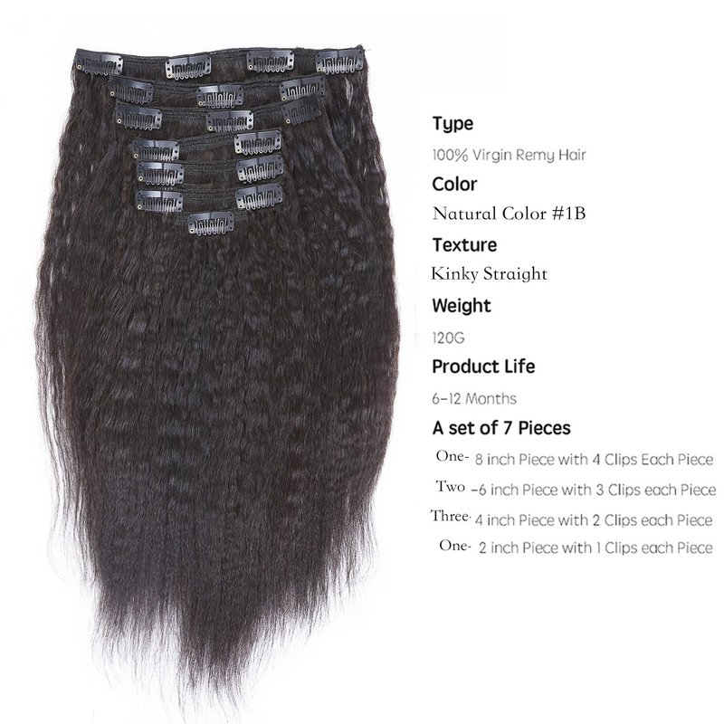 - Texture & Pattern: The Kinky Straight Texture is between Light Yaki Straight and Coarse Yaki Hair,the Kinky Straight Clip in Extensions can be Stay Straight Very Long without Flat Ironed.