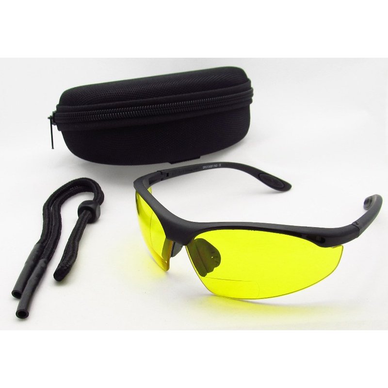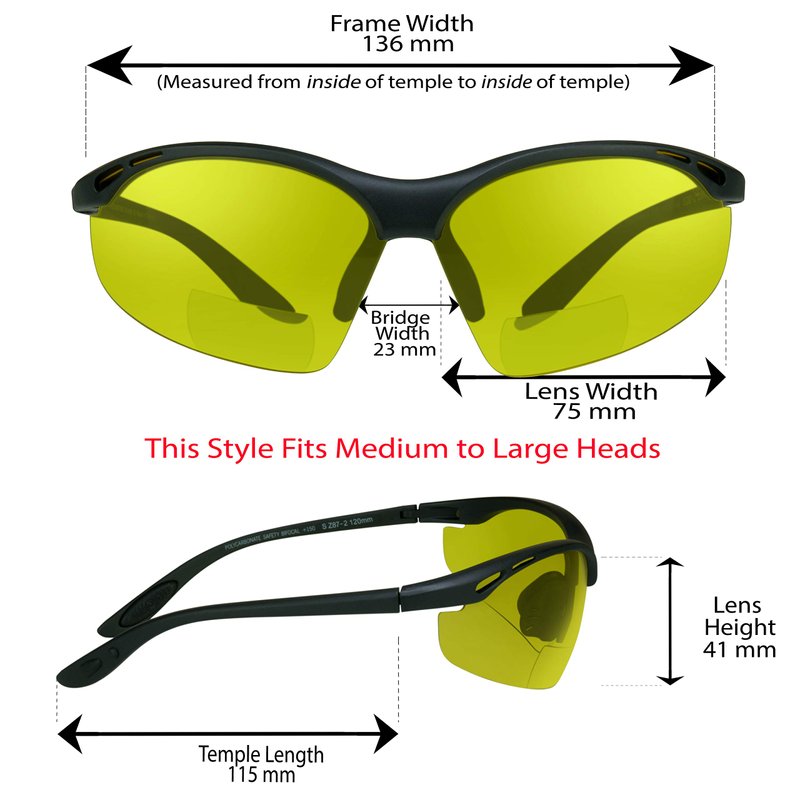 Methane biker yellow lens bifocal readers +2.50 are equipped with ANSI Z87.1 safety rated impact resistant polycarbonate lenses. Wraparound semi rimless frames protect your eyes from the harmful UVs, wind, dust and debris. Rubberized nose pieces and temples provide snug and comfortable fit. Yellow tint, also known as night vision is perfect for night riding, cloudy days and rainy days as well. They are also great for cycling, running, hunting, driving, fishing and golfing. Fits MEDIUM to most of Extra LARGE heads. Fits also lower nose bridge faces. Free Deluxe Nylon Water Resistant Hard Case with Zipper and Belt Clip and Sunglass Strap are included!
