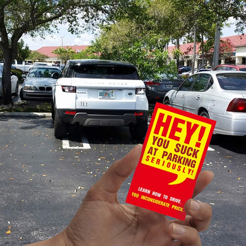 - Bad parking cards: distributing instant justice to the disrespectful idiots incapable of following the basic rules of parking lot decency.